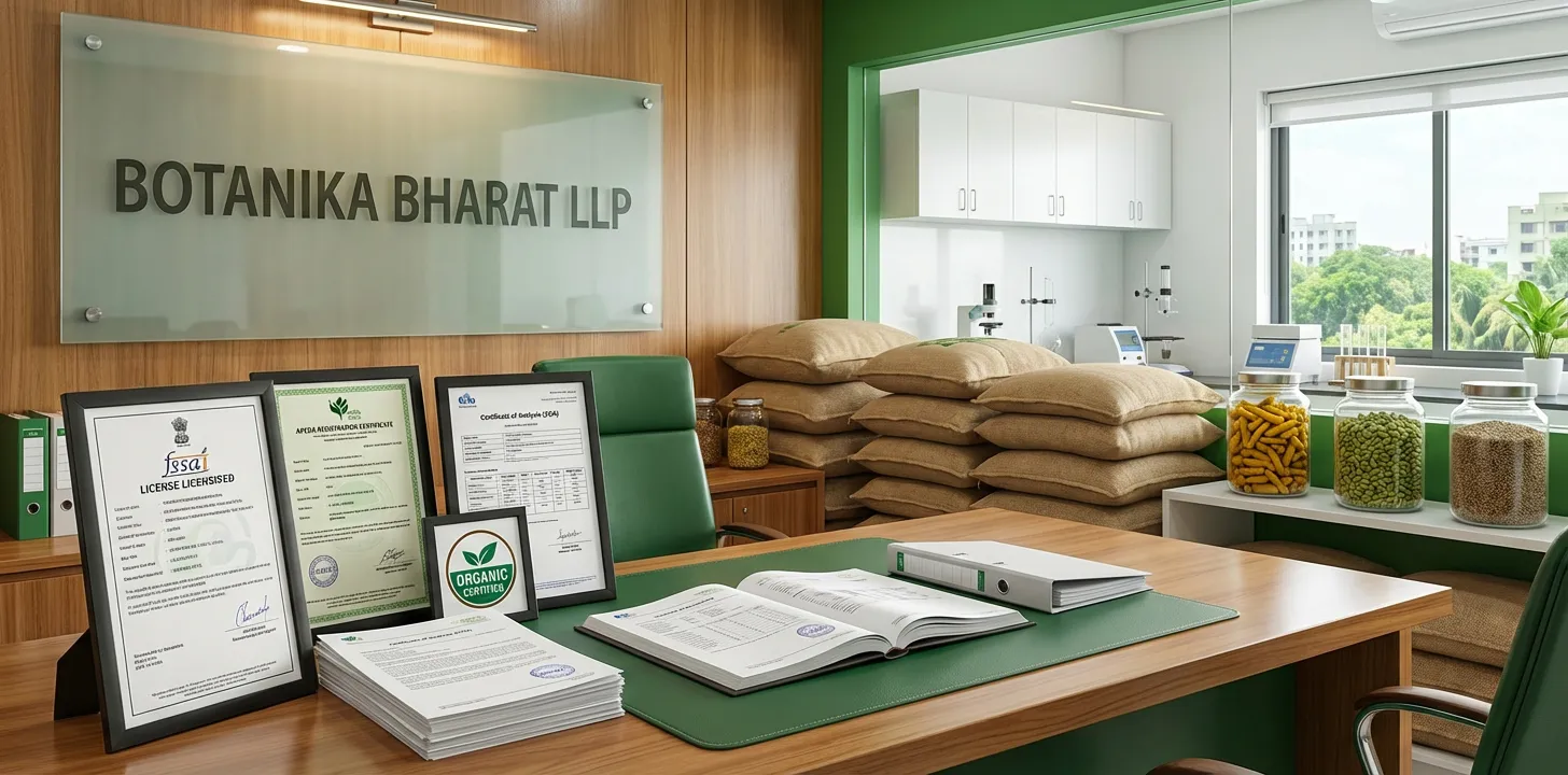 This page describes the certifications and quality standards that Botanika Bharat LLP follows as an Indian spice exporter, spice manufacturer India, bulk spices supplier, organic spices exporter, herbs and spices supplier, medicinal herbs exporter, and agro commodity exporter India based in Rudrapur, Uttarakhand. We operate with FSSAI licence (Central 10251007107816296), valid IEC, GST, and APEDA alignment. Every export shipment is backed by lab testing and we provide Certificate of Analysis (COA); we arrange phytosanitary and organic (NPOP/NOP) certificates where applicable. Importers, distributors, bulk buyers, FMCG manufacturers, traders, and government or institutional buyers can rely on our documented quality and compliance.