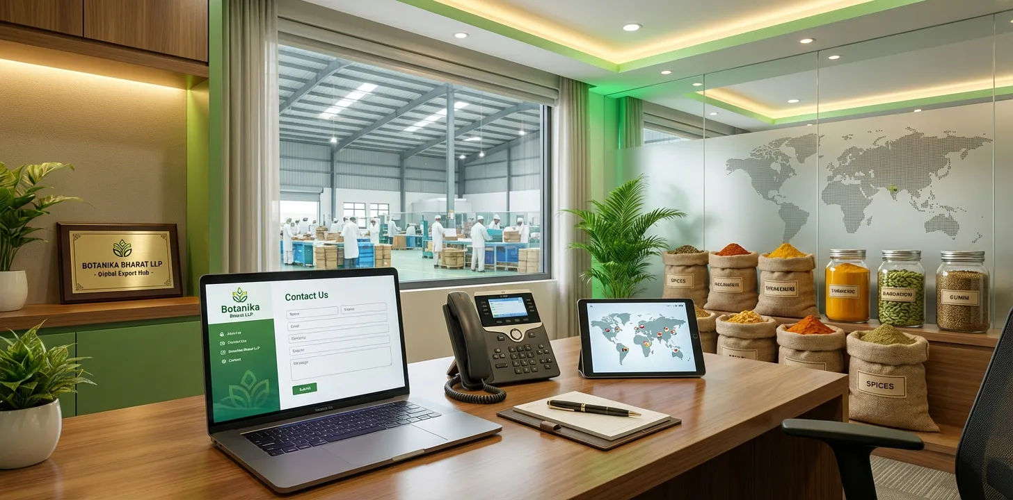 Botanika Bharat LLP brings the essence of Indian spices and agricultural excellence to the world—elegance in quality, documentation, and partnership. When you contact us, we aim to deliver clarity and trust. India’s spice heritage is built on purity and trust; today we carry that legacy with a modern, compliance-driven approach. Elegance in our context means: clear specifications, COA with every shipment, phytosanitary and organic certificates where required, and traceability from source to delivery. This Contact Us page is written for importers, distributors, bulk buyers, FMCG manufacturers, traders, and government or institutional buyers who want to reach us for export enquiries.