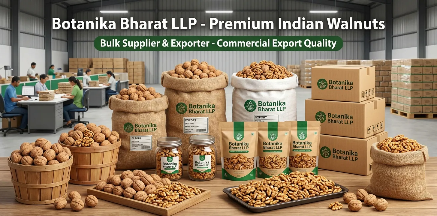 Dried nuts walnuts hold an important place in daily life and in global trade. They are a key category in FMCG, HORECA, bakery, confectionery, snacks, and retail. They are used by food and bakery manufacturers, FMCG brands, HORECA, and consumers. As a raw material or finished product they support consistent quality in the supply chain. For growers and processors in India they are a valuable segment; for importers and distributors they are a staple in the dried nuts category. At Botanika Bharat LLP we recognise this importance. We supply Indian dried nuts walnuts with COA and specifications where applicable so that buyers get the quality they need. We help buyers find the best quality material, we help farmers get better rates where we source from farm level, and we help other exporters with sourcing and documentation. We are an Indian dried nuts walnuts exporter, bulk walnut supplier, and agro commodity exporter India committed to supply and documentation that support your business and your market.