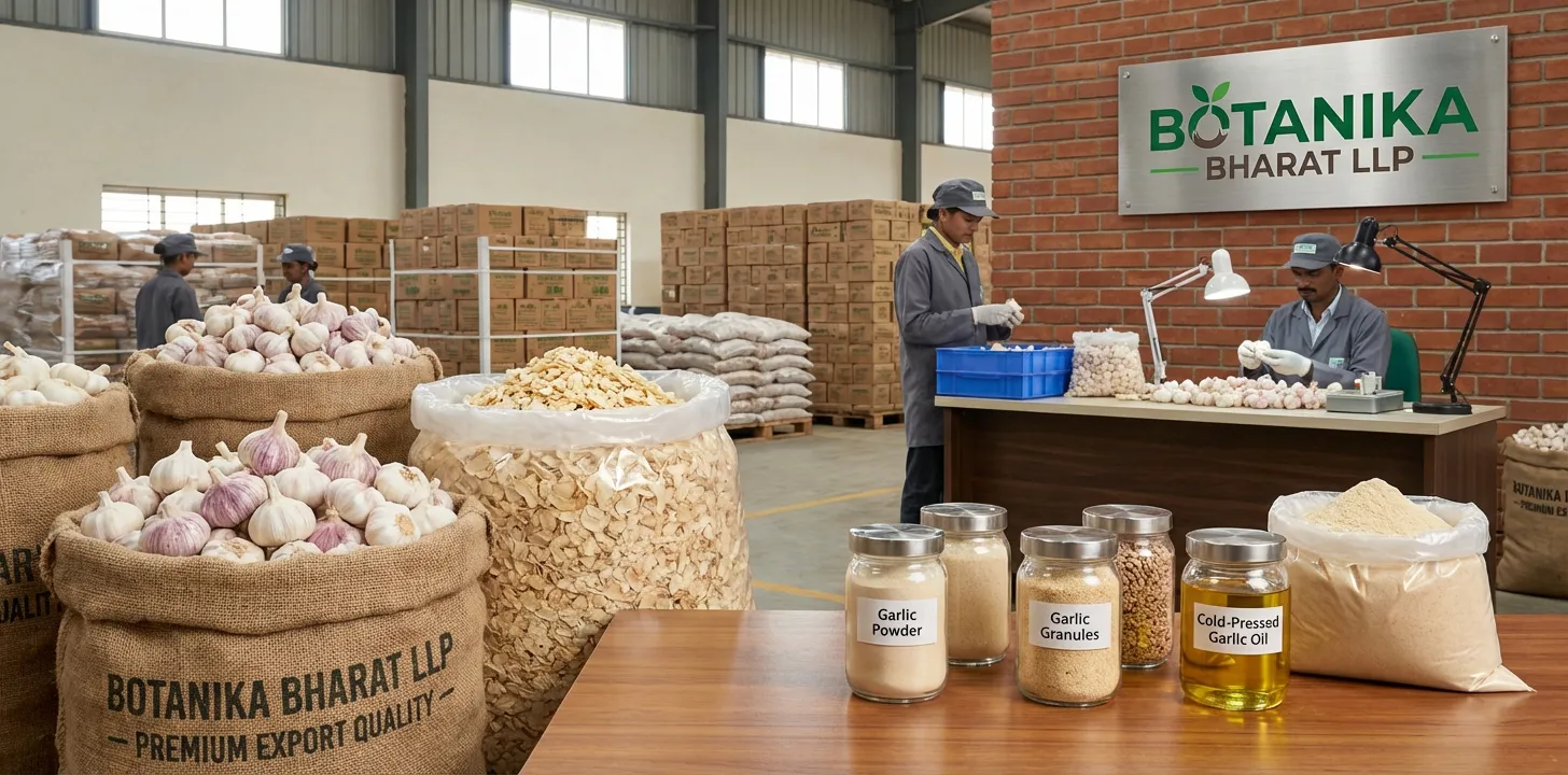 Botanika Bharat LLP brings the essence of Indian garlic and agro commodities to the world through export. India’s garlic and dehydrated vegetable heritage is built on purity and trust; today we carry that legacy with reliable supply, clear specifications, and full documentation. Elegance in our context means clarity: clear product specifications, clear COA, and clear documentation so that buyers know what they are buying, what quality they get, and how to clear customs and pay. This Garlic page is written for importers, distributors, bulk buyers, FMCG manufacturers, flavour companies, traders, and government or institutional buyers who need fresh garlic, dehydrated garlic flakes, garlic powder, garlic oil, or garlic oleoresin with quality and documentation they can trust. We have structured the content so that you can quickly find what you need: our product range, our approach to quality and compliance, and how we help buyers find the best quality material.