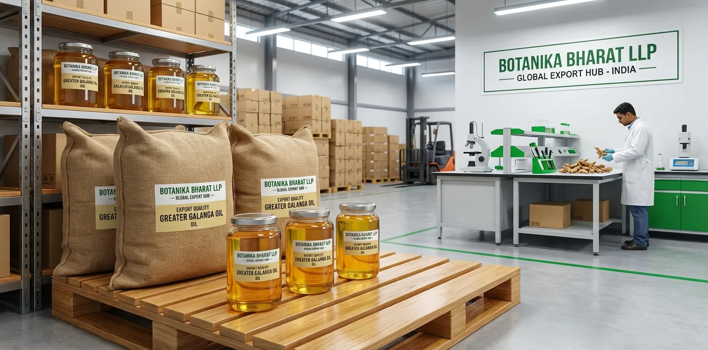 Botanika Bharat LLP supports India’s global export leadership as a trusted Indian greater galanga oil exporter, essential oil supplier, agro commodity exporter India, and FMCG raw material supplier. India contributes to global greater galanga oil supply. We contribute to this leadership by delivering reliable supply of Indian greater galanga oil with COA where applicable and full documentation. This Greater Galanga oil page is structured so that buyers and importers can find us when they look for Indian greater galanga oil exporter, essential oil supplier, buy greater galanga oil from India, agro commodity exporter India, FMCG raw material supplier, herbs and spices supplier—and when they look for HS codes, APEDA, phytosanitary, FMCG HORECA retail, and related terms.