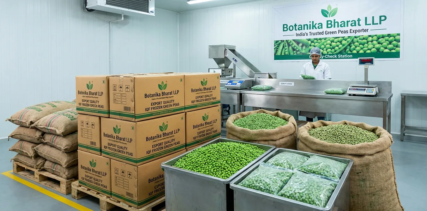 Botanika Bharat LLP supports India’s global export leadership as a trusted Indian green peas exporter, bulk green peas supplier, agro commodity exporter India, and FMCG raw material supplier. India is a significant producer and exporter of green peas (matar). We contribute to this leadership by delivering reliable supply of Indian green peas—IQF frozen green peas, fresh green peas, dried matar—with COA and full documentation. This Green Peas page is structured so that buyers and importers can find us when they look for Indian green peas exporter, bulk green peas supplier, IQF frozen green peas, fresh matar, dried peas, buy green peas from India, organic green peas exporter, agro commodity exporter India, FMCG raw material supplier, fresh and frozen produce—and when they look for green peas HS code 0710 21 00, 0708 10, 0713 10 00, APEDA, phytosanitary, and related terms.