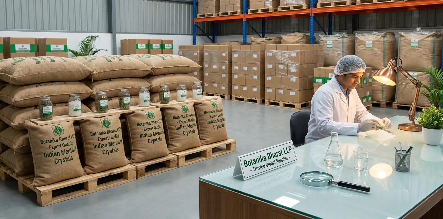Botanika Bharat LLP supports India’s global export leadership as a trusted Indian menthol crystal exporter, essential oil supplier, agro commodity exporter India, and FMCG raw material supplier. India contributes to global menthol crystal supply. We contribute to this leadership by delivering reliable supply of Indian menthol crystal with COA where applicable and full documentation. Buyers and importers can find us when they look for Indian menthol crystal exporter, menthol crystal bulk supplier, menthol crystal wholesaler India, buy menthol crystal from India, agro commodity exporter India, FMCG raw material supplier, herbs and spices supplier—and when they look for HS code 3301, APEDA, phytosanitary, and related terms.
