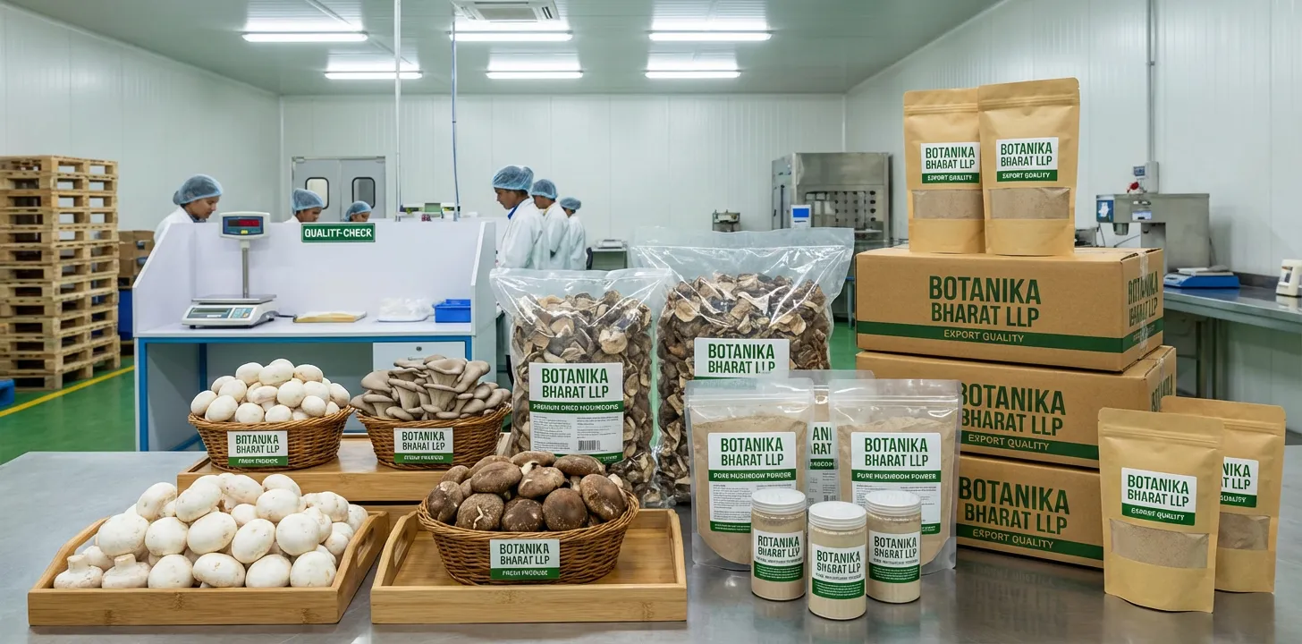 Mushroom holds an important place in daily life and in global trade. They are a key category in FMCG, HORECA, retail, and distribution. They are used by food manufacturers, FMCG brands, HORECA, and consumers. As a raw material or finished product they support consistent quality in the supply chain. For farmers and processors in India they are a valuable segment; for importers and distributors they are a staple in the fresh and dried produce category. At Botanika Bharat LLP we recognise this importance. We supply Indian mushroom with COA and specifications where applicable so that buyers get the quality they need. We help buyers find the best quality material, we help farmers get better rates where we source from farm level, and we help other exporters with sourcing and documentation. We are an Indian mushroom exporter, fresh dried mushroom bulk supplier, and agro commodity exporter India committed to supply and documentation that support your business and your market.