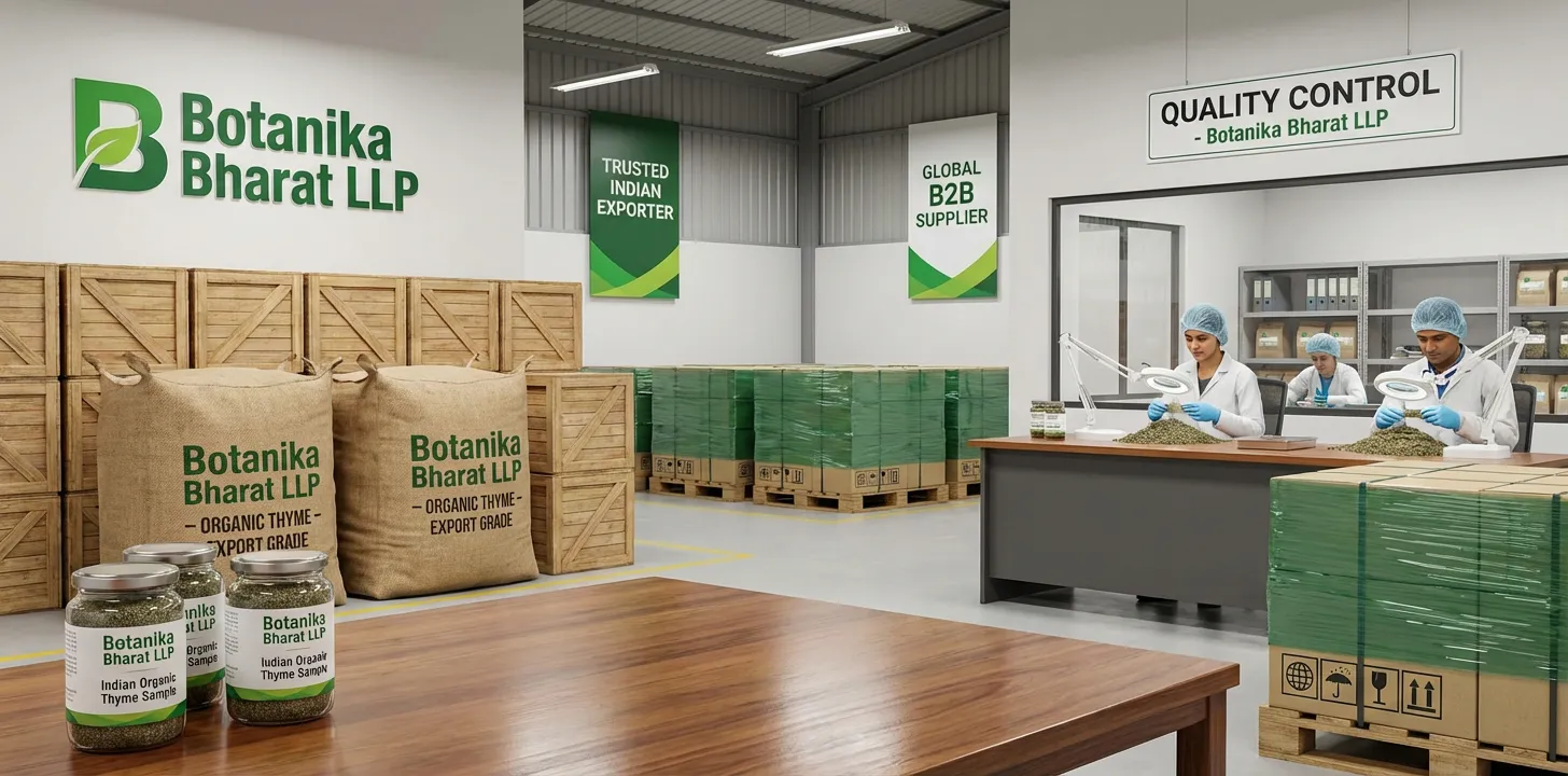 Importers and bulk buyers of organic thyme should consider: origin (India), certification (organic, FSSAI, APEDA), volatile oil and moisture levels, packaging type and weight, Incoterms (FOB, CIF, CFR, DDP), payment terms (advance, L/C, DP, DA), and lead time. At Botanika Bharat LLP we provide clear specifications, sample on request, COA with every shipment where applicable, and full export documentation including phytosanitary and Certificate of Origin where required. We help you qualify Indian organic thyme supply with transparency and long-term partnership in mind. Contact us for a buyer’s checklist and quote.