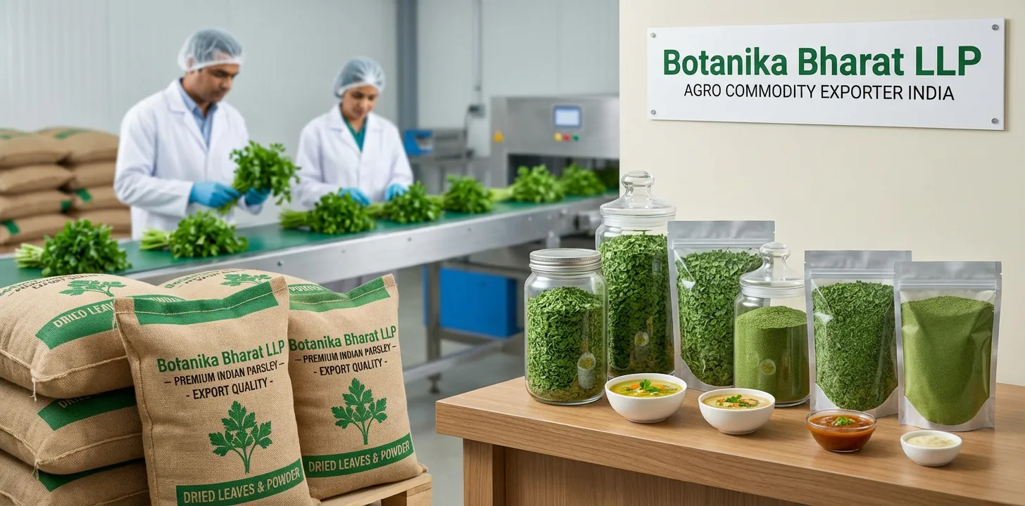 Parsley holds an important place in daily life and in global trade. It is a key herb in garnish, soups, sauces, Mediterranean and European cuisine—and in FMCG, HORECA, retail, and distribution. It is used by food manufacturers, FMCG brands, HORECA, and consumers. As a raw material (dried parsley leaves, parsley powder) it supports consistent quality in the supply chain. For farmers and processors in India it is a valuable segment; for importers and distributors it is a staple in the herbs and spices category. At Botanika Bharat LLP we recognise this importance. We supply Indian parsley with COA and specifications where applicable so that buyers get the quality they need. We help buyers find the best quality material, we help farmers get better rates where we source from farm level, and we help other exporters with sourcing and documentation. We are an Indian parsley exporter, bulk parsley supplier, and agro commodity exporter India committed to supply and documentation that support your business and your market.