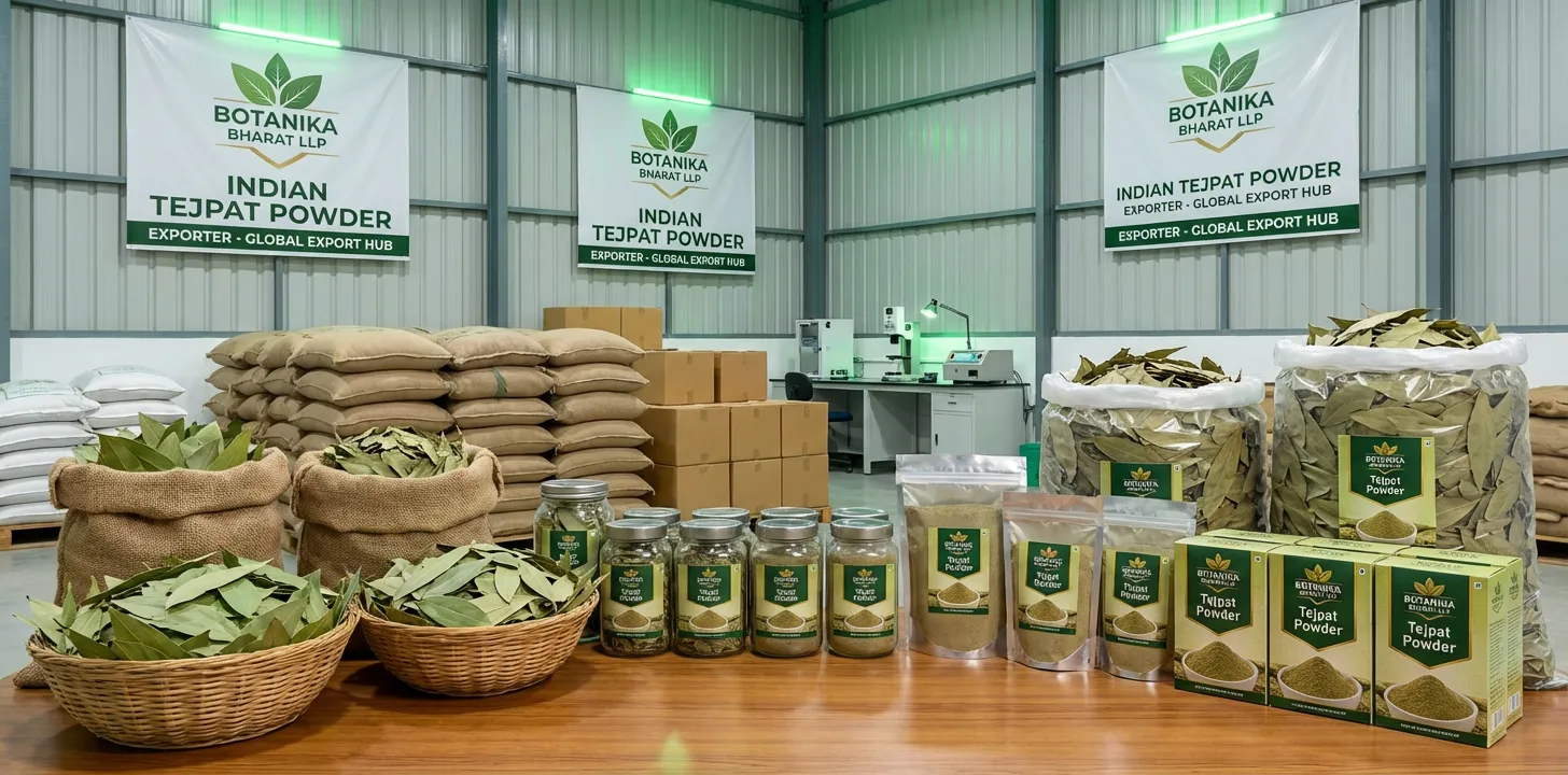 India is a growing producer and exporter of tejpat powder (Indian bay leaf, tej patta) in the world. India has a long tradition of spice cultivation and tejpat is used in biryani, pulao, garam masala, and curry; today India supplies a wide range of tejpat powder for domestic and export markets. India’s share in global spice trade continues to grow, and Indian tejpat powder is known for quality and value. As a trusted Indian tejpat powder exporter and bulk tejpat powder supplier, Botanika Bharat LLP contributes to India’s position by supplying quality Indian tejpat powder with COA where applicable and full documentation so that global buyers can rely on Indian origin. We help buyers find the best quality material, we help farmers get better rates where we source from farm level, and we help other exporters with sourcing and documentation. Contact us for supply and for the grade and certification that suit your market. We are your partner from India.
