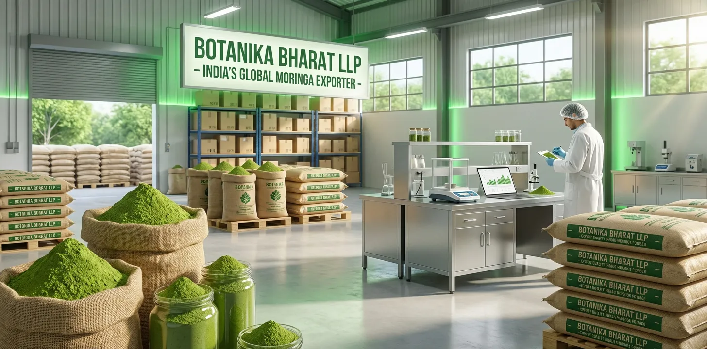 Moringa powder holds an important place in daily life and in global trade. It is a key category in FMCG, HORECA, retail, and distribution as a health powder and superfood ingredient. It is used by food and nutraceutical manufacturers, FMCG brands, HORECA, and consumers. As a raw material or finished product it supports consistent quality in the supply chain. For farmers and processors in India moringa is a valuable segment; for importers and distributors moringa powder is a growing category in health powders and superfoods. At Botanika Bharat LLP we recognise this importance. We supply Indian moringa powder with COA and specifications where applicable so that buyers get the quality they need. We help buyers find the best quality material, we help farmers get better rates where we source from farm level, and we help other exporters with sourcing and documentation. We are an Indian moringa powder exporter, moringa powder bulk supplier, and agro commodity exporter India committed to supply and documentation that support your business and your market.