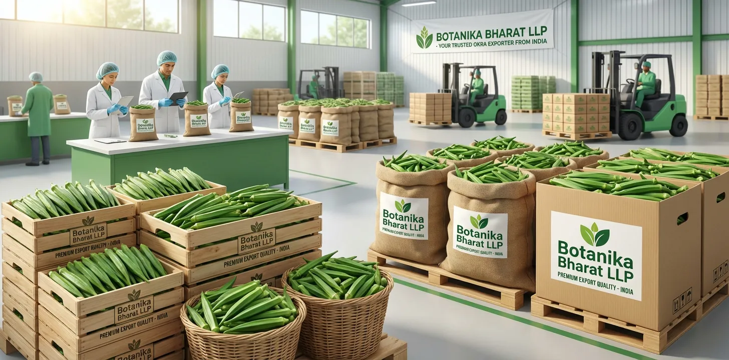 We are an Indian okra exporter, fresh okra bulk supplier, agro commodity exporter India, and FMCG raw material supplier committed to excellence in supply. We invite you to partner with Botanika Bharat LLP for okra with full quality and documentation you can trust.