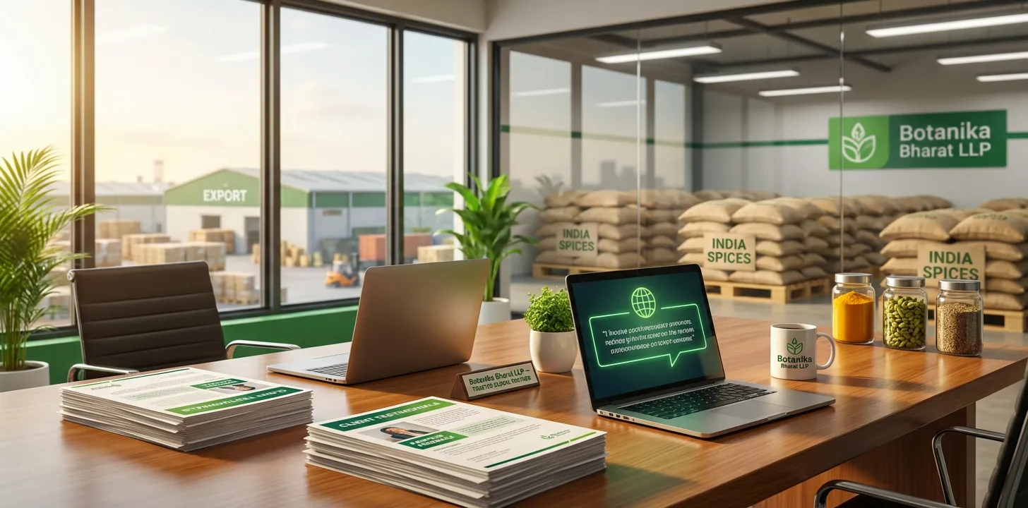 Global buyers and procurement teams look for proof: who has the supplier worked with, what do partners say, and can they deliver at scale with full documentation. At Botanika Bharat LLP we answer these questions through documented client testimonials and partner feedback. We serve importers and distributors across North America, Europe, the Middle East, and Asia with spices, herbs, ashwagandha, giloy, turmeric, ginger, black pepper, cardamom, cumin, coriander, rice, health powders, oleoresins, essential oils, and hundreds of agro commodities. Every testimonial we share is grounded in real consignments, real documentation, and real relationships. Our office is at Office No-18, 1st Floor, Ramavihar, Infront of Shiv Enclave, Near Shimla Bahadur, Fulsunga, Ward No-01, Rudrapur, Dist- U S Nagar (Uttarakhand) Pin-263153. Contact: Mobile +91 9666668428, Landline +91 5944 369845, Email [email protected] and [email protected]. Business hours: Monday to Saturday, 10:00 AM to 7:00 PM.
